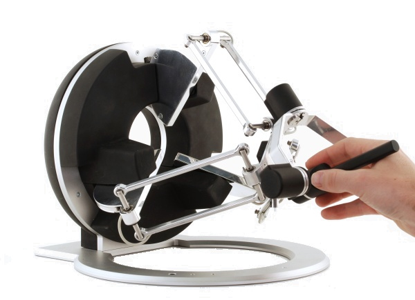 With fine polished kinematic links and an anodized aluminum frame, the omega.3 displays unparalleled solidity with simplicity and style. Its finely textured spherical end-effector offers a universal interface for both left- and right-handed users. This highly ergonomic and distinctive design makes the omega.3 a device of choice when performing dexterous robotic telemanipulation tasks, or for instinctively interacting with complex virtual environments that demand user-friendly interfaces with optimal usability.